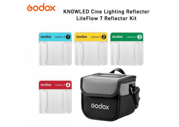 The KNOWLED LiteFlow 7 Reflector Kit from Godox's Cine Lighting Reflector system features four 3 x 3" LiteFlow 7 reflector boards with varying diffusion strengths, ranging from a hard to a soft strip ray of light. A soft carry case is included to accommodate the entire kit.